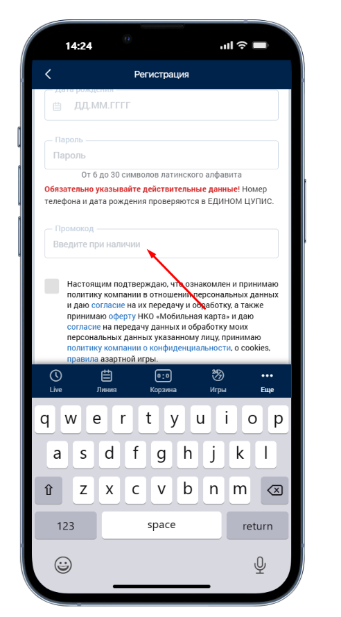 Если у пользователя есть специальный код, его необходимо указать сразу в анкете. Это позволит активировать приветственное предложение для новых клиентов. После завершения создания профиля добавить промокод уже нельзя.