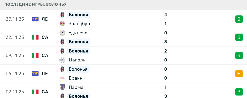 Единственный командой, которую «Болонья» не смогла обыграть в пяти последних матчах, стал «Бранн» в Лиге Европы. Во остальных случаях команда одержала победы над «Пармой, «Наполи», «Удинезе» и «Зальцбургом».