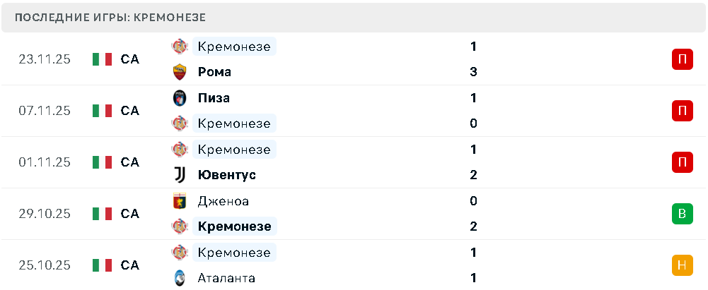 В пяти последних матчах «Кремонезе» одержал только одну победу над «Дженоа» и сыграл вничью с «Аталантой». После этого команда потерпела поражения от «Ювентуса», «Пизы» и «Ромы».