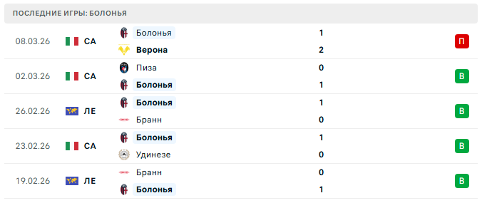 08.03.26: Болонья упустила очередную домашнюю игру, пропустив от Вероны дважды при 19 ударах в сторону ворот — хроническая неэффективность в завершении снова стала приговором.