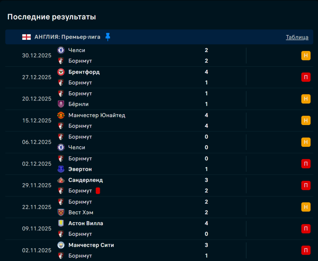 «Борнмут» сыграл вничью с «Челси» (2:2), уступил «Брентфорду» (1:4), разошёлся миром с «Бернли» (1:1) и «Манчестер Юнайтед» (4:4), а также не проиграл «Челси» (0:0). В четырёх из пяти матчей проходил «обе забьют» и ТБ(2,5). Команда регулярно участвует в результативных поединках, но не способна удерживать преимущество.