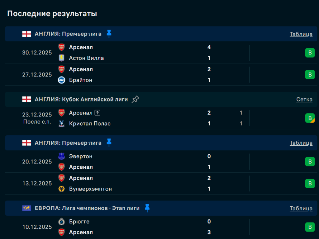 Под руководством Микеля Артеты «Арсенал» демонстрирует лучшую оборону лиги (12 пропущенных, xGA — 11,90 при 9 пропущенных) и мощную атаку (37 голов, xG — 29,06 при 28 забитых). Тактика — 4-3-3 с контролем мяча и акцентом на второй тайм: в 25 последних матчах во второй половине не проигрывали, забивая в 22 из них. Последние победы над «Брайтоном» (2:1), «Эвертоном» (1:0) и разгром «Астон Виллы» (4:1) подтверждают форму.