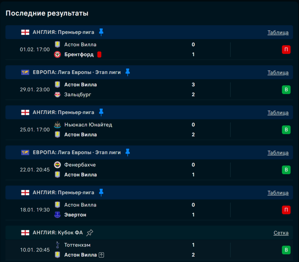 Последние игры Астон Вилла