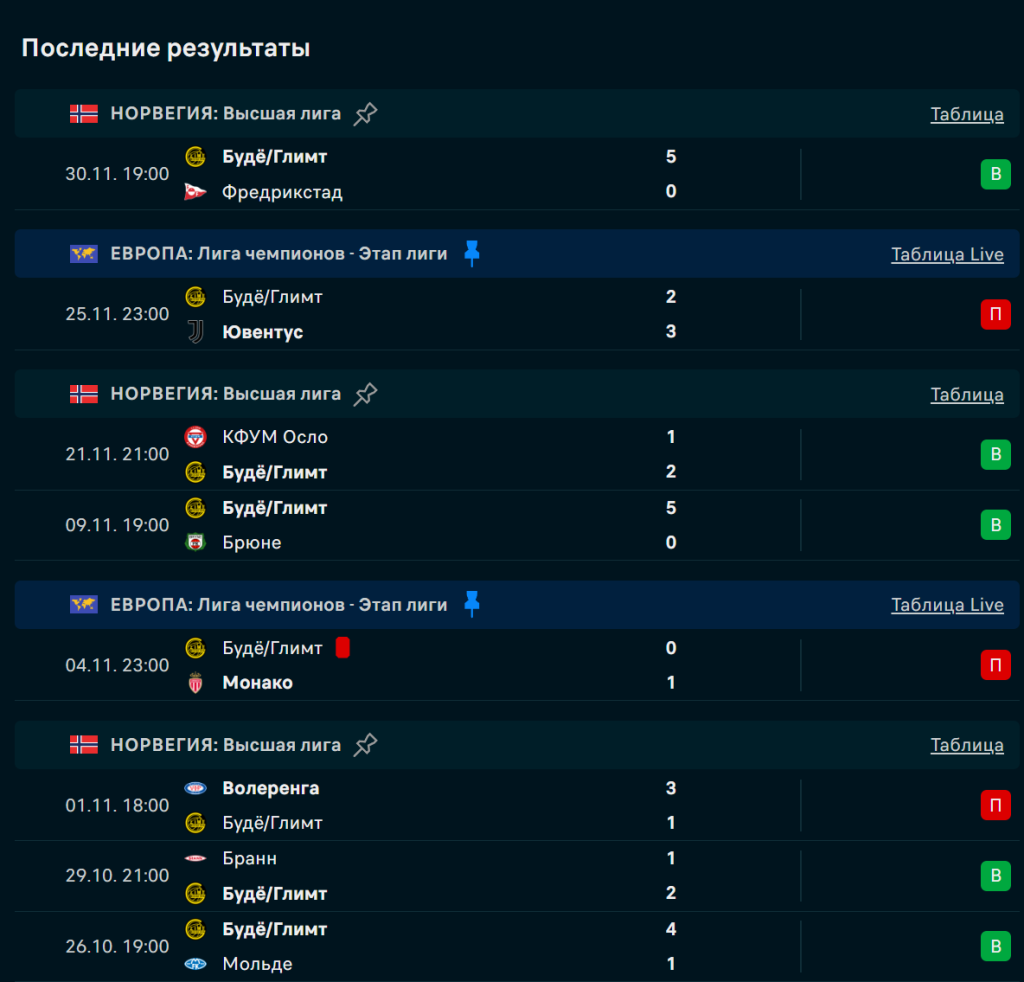 «Будё-Глимт» уступил титул в Элитсерии, проиграв «Викингу» на 1 очко. В ЛЧ команда не выигрывает с сентября: 4 поражения и 1 ничья. При этом гости забили «Галатасараю», «Монако» и «Ювентусу», демонстрируя характер. Однако оборона уязвима: 11 пропущенных за 5 матчей. В составе — дисквалификация Гундерсена, под вопросом Эукленд и Берг.