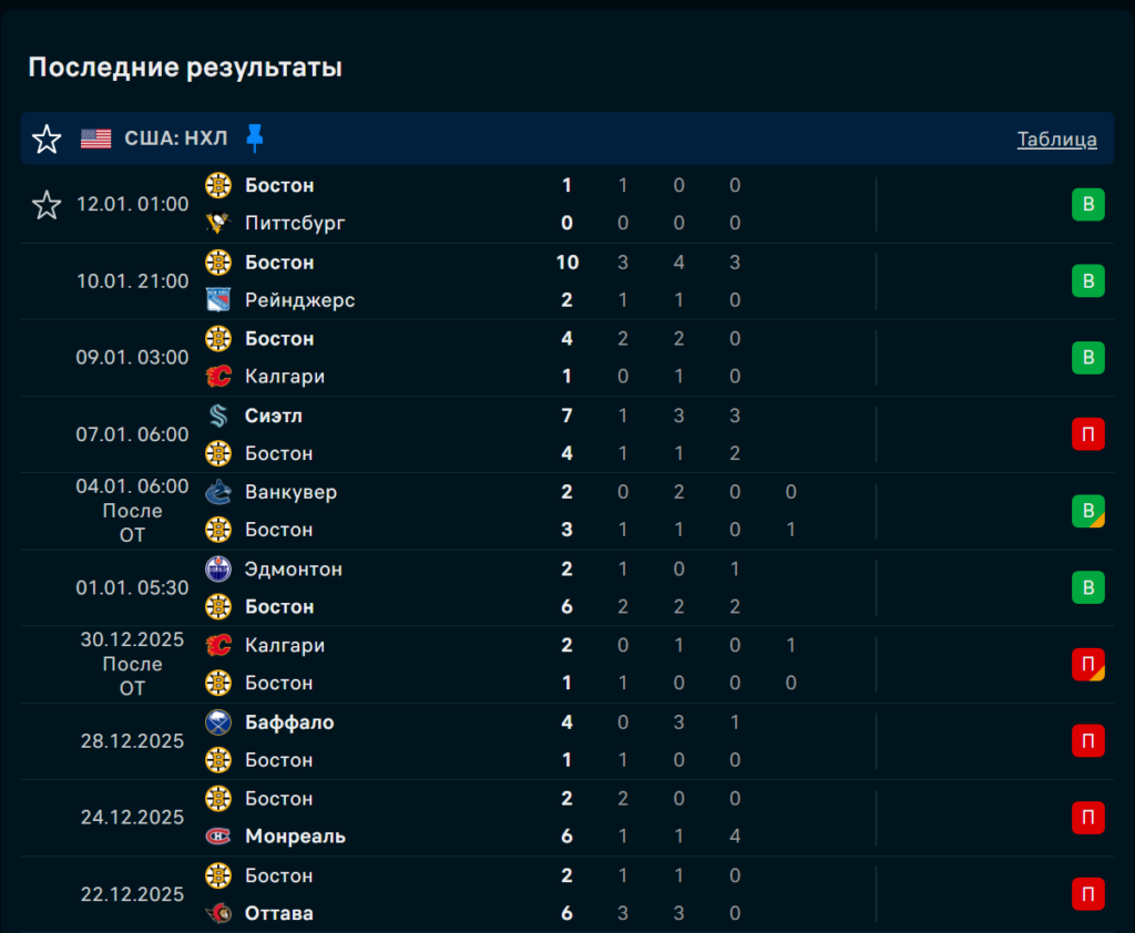 «Бостон» победил «Питтсбург» (1:0), «Рейнджерс» (10:2), «Ванкувер» (3:2), уступил «Сиэтлу» (4:7) и дважды проиграл «Калгари» (1:2). В четырёх из пяти матчей проходил тотал больше 5,5. Даже в «сухой» победе над «Питтсбургом» команда создала 30+ бросков, что указывает на постоянное давление в атаке.