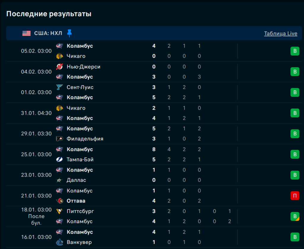 «Коламбус» подлетел к паузе на идеальной волне: дома выиграли 4:2 у «Чикаго», затем 5:3 у «Сент-Луиса», после чего снова закрыли «Чикаго» 4:0 на выезде и «Нью-Джерси» 3:0, а вишенкой стала победа 4:1 над «Каролиной». Играют смело через скорость, но в чужой зоне многое держится на подборе и первом пасе.