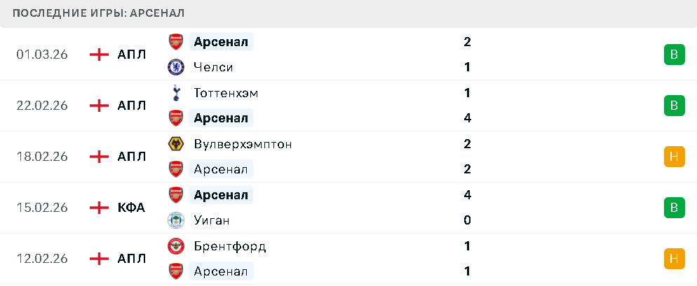 «Канониры» за аналогичный отрезок сыграли вничью с «Брентфордом» и «Вулверхэмптоном», но при этом одержали важные победы над «Уиганом» в кубковом турнире, а также в принципиальных встречах против «Тоттенхэма» и «Челси». Эти результаты подтверждают серьезность намерений лондонцев в чемпионской гонке и их умение добиваться результата в ключевых матчах.