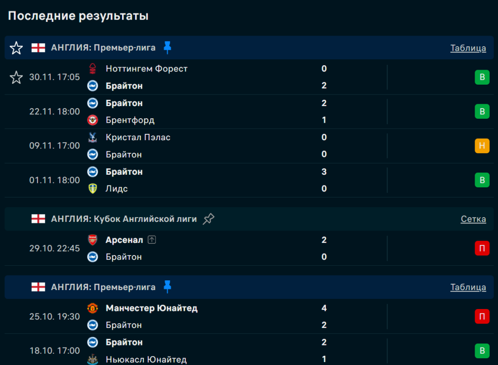 Брайтон занимает 5-е место в турнирной таблице АПЛ с 22 очками после 13 туров. Команда демонстрирует сбалансированную игру: 21 гол забито, 16 пропущено. По xG Брайтон должен был забить 19,75 голов и пропустить 17,47 — фактические показатели даже немного лучше, что говорит о стабильности без аномального везения. «Чайки» уверенно играют дома: в шести последних матчах на «Фалмере» — 4 победы и 2 ничьи.