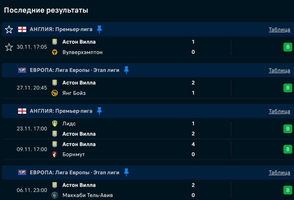 Астон Вилла выиграла четыре из пяти последних матчей, уступив только Ливерпулю в начале ноября. Среди побед — уверенные успехи над Вулверхэмптоном (1:0), Лидсом (2:1), Борнмутом (4:0) и двумя еврокубковыми соперниками. Команда демонстрирует высокую результативность и надёжную оборону, однако по xG пропустила 11 голов при ожидаемых 18,32, что свидетельствует о значительном везении в обороне и риске регресса.