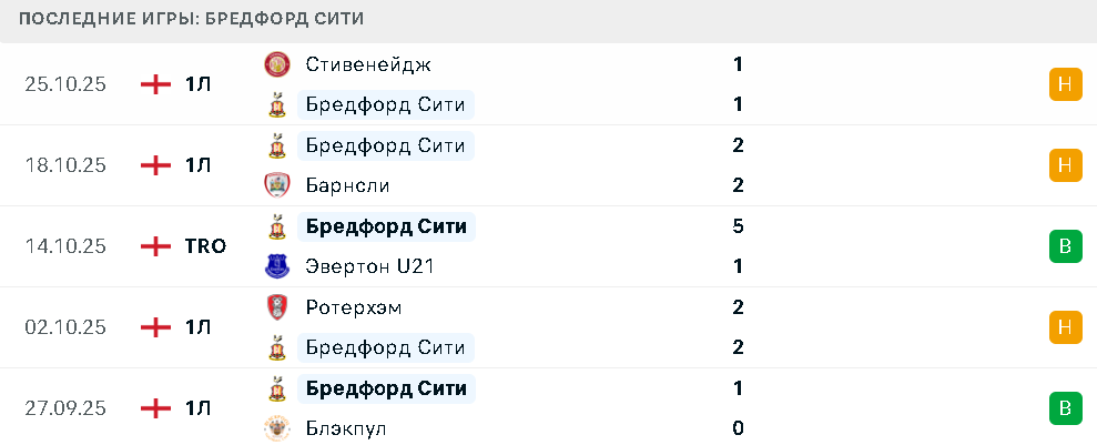 В пяти последних матчах в разных турнирах Бредфорд Сити одержал победы над Блэкпулом и молодежным Эвертоном, а также сыграл вничью с Ротерхэмом, Барнсли и Стивенэйджем.