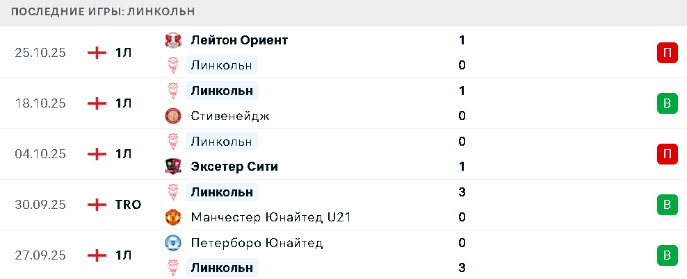 В пяти последних матчах в разных турнирах Линкольн потерпел поражения от Лейтон Ориент и Эксетер Сити. В остальных случаях были победы над Петерборо Юнайтед, молодежкой Ман Юнайтед и Стивенэйджем.