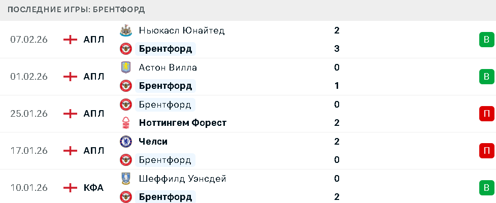 Помимо уже упомянутого поражения от «Ноттингем Форест», в пяти последних матчах «Брентфорд» также уступил «Челси». В остальных встречах «пчелы» в Кубке Англии уверенно прошли «Шеффилд Уэнсдей», а в рамках АПЛ одержали минимальные победы над «Астон Виллой» и «Ньюкаслом», что говорит о прагматичном стиле игры.