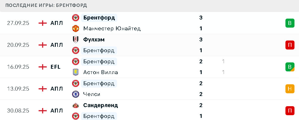 В пяти последних матчах в разных турнирах Брентфорд в основное время потерпел поражения от Сандерленда и Фулхэма, сыграл вничью с Челси и Астон Виллой, а также одержал победу над Манчестер Юнайтед.
