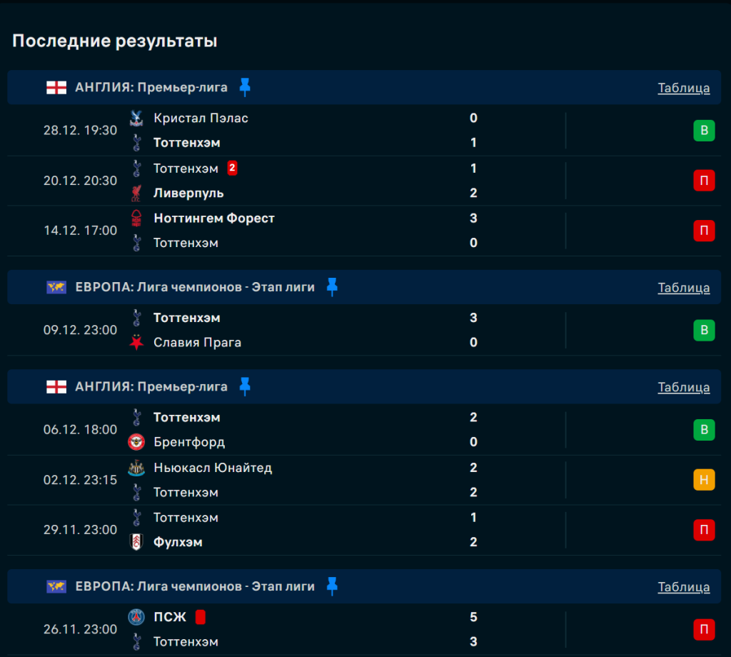 Последние пять очных матчей: четыре победы «Тоттенхэма», одна ничья. В двух последних визитах в Лондон «шпоры» выиграли 2:0 и 3:1. Однако текущая форма и кадровый дефицит гостей меняют баланс. Средняя результативность в этих матчах — 3,4 гола за игру.