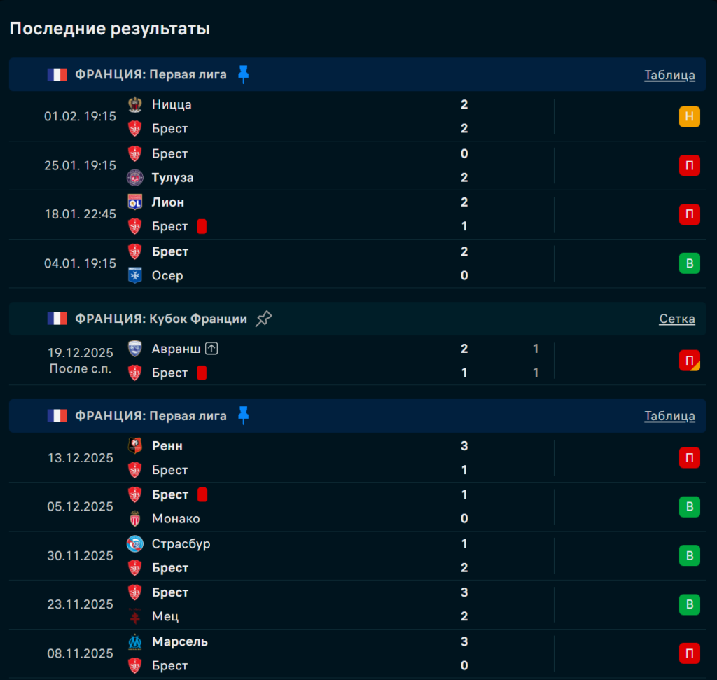 Серия выглядела неровной, но без провалов по содержанию. Была ничья 2:2 в Ницце с крепким вторым таймом, до того домашнее поражение 0:2 от «Тулузы» с потерей инициативы после пропущенного и выездная неудача 1:2 в Лионе, где подвела игра между линиями. Ранее дома «Брест» взял победу 2:0 над «Осером», а кубковый выезд к «Авраншу» завершил ничьёй 1:1. В общих чертах хозяйская модель держится: компактность, подбор на дуге, ставка на один‑два качественных розыгрыша.
