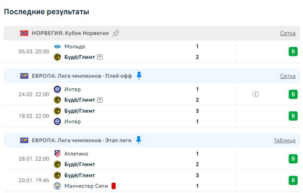 В стыках норвежцы выбили из розыгрыша прошлогоднего финалиста Лиги чемпионов «Интер», дважды обыграв итальянцев — 3:1 и 2:1. Самое удивительное в том, что норвежский чемпионат до сих пор не стартовал, то есть фактически команда проделывает еврокубковый путь в межсезонье. Только в прошлый четверг «Буде-Глимт» впервые в 2026 году сыграл на внутренней арене — в 1/8 финала Кубка Норвегии победил в гостях «Мольде» 2:1.