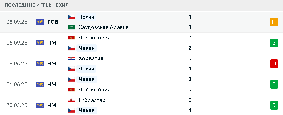 В пяти последних матчах сборная Чехии одержала победы над Гибралтаром и Черногорией (дважды). Также было поражение от хорватов и ничья с Саудовской Аравией.