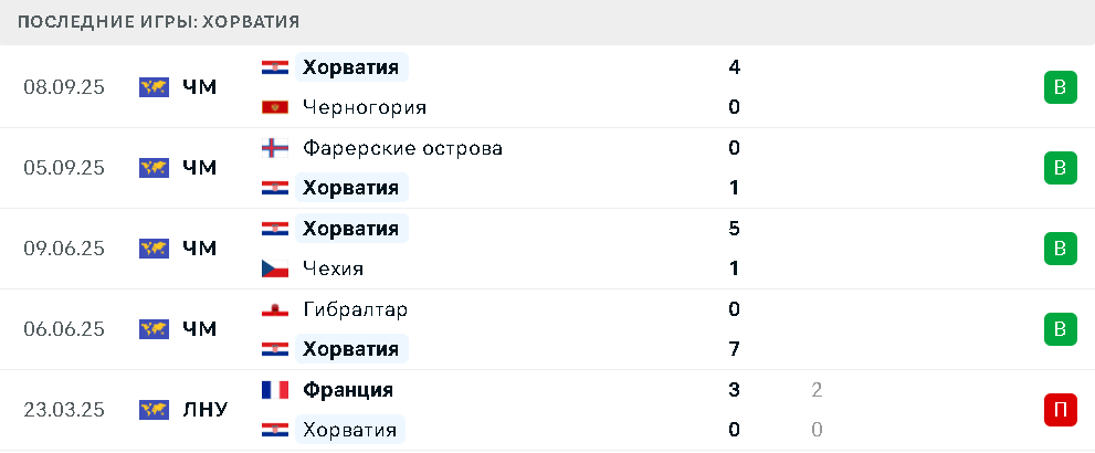 В пяти последних матчах в разных турнирах Хорватия проиграла Франции, после чего одержала победы над Гибралтаром, Чехией, Фарерами и Черногорией.