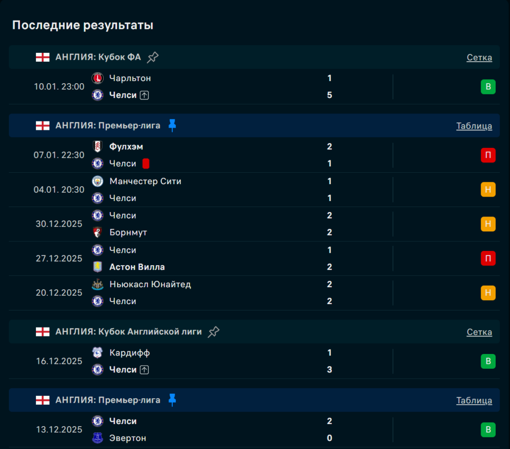 Последние игры Челси