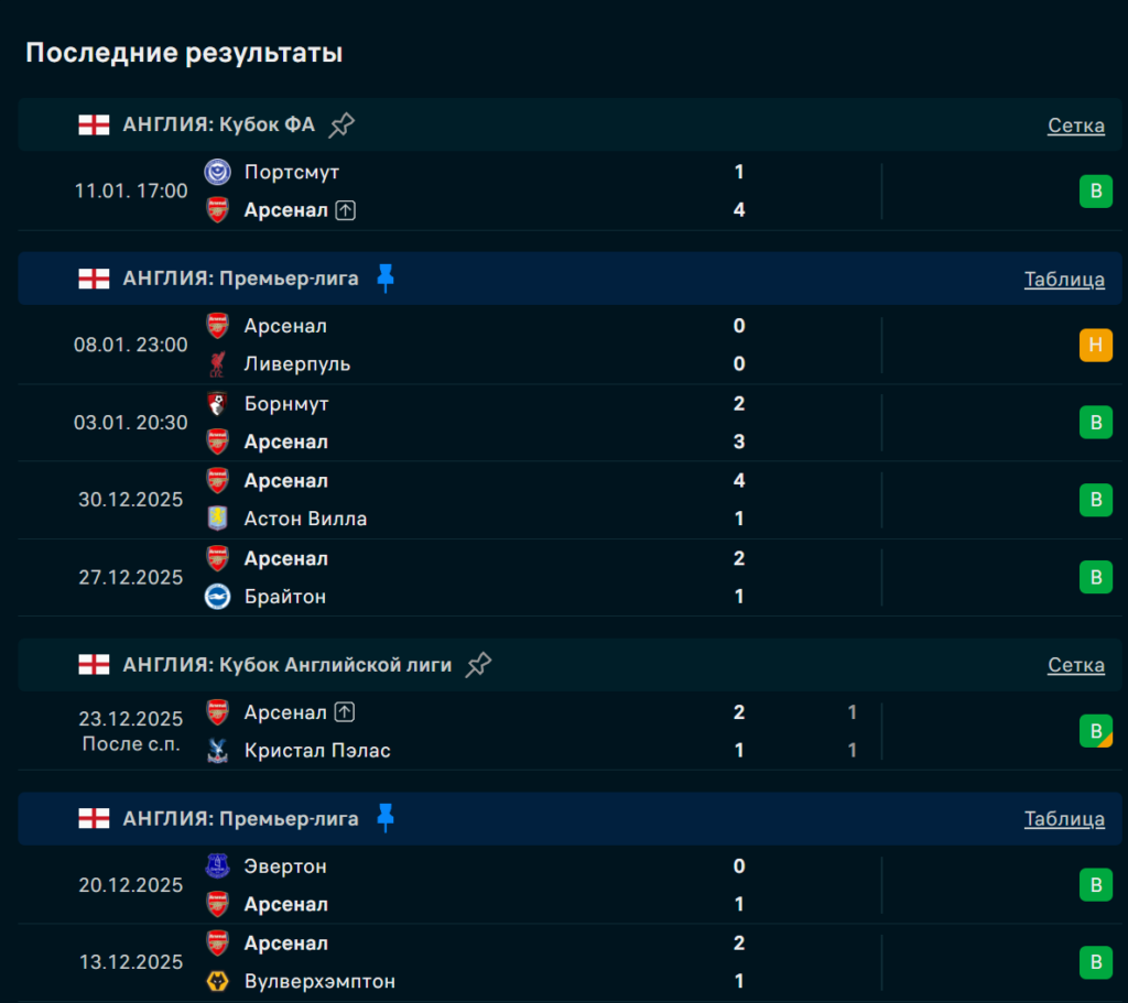 «Канониры» лидируют в АПЛ и демонстрируют баланс между атакой и обороной: 21 гол забит, 9 пропущен в последних 10 матчах. В Кубке лиги команда прошла «Порт Вейл» (2:0), «Брайтон» (2:0) и «Кристал Пэлас» (1:1, победа по пенальти). Глубина состава позволяет Артете проводить масштабную ротацию без потери качества. Стандарты — ключевое оружие: 12 голов с них, при этом пропущено всего 5.