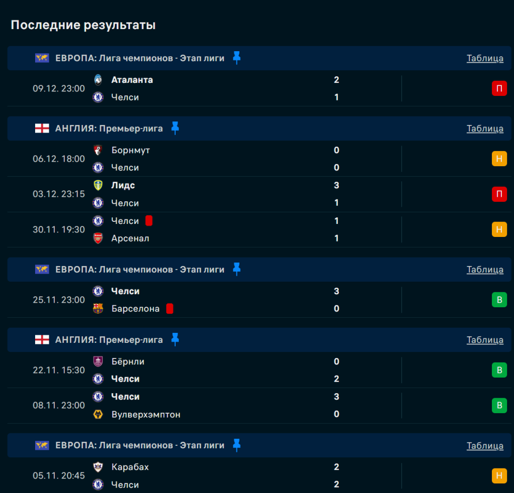 «Челси» уступил «Лидсу» (1:3), сыграл вничью с «Борнмутом» (0:0), «Арсеналом» (1:1), проиграл «Аталанте» (1:2) и выиграл у «Барселоны» (3:2). В 4 из 5 матчей — поражения или ничьи.