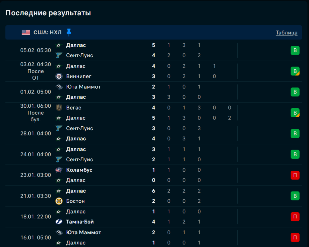 «Даллас» будто принципиально не выигрывает тихо: 5:4 у «Вегаса», 3:2 с «Ютой», 4:3 у «Виннипега», 5:4 у «Сент-Луиса», затем 3:2 против «Сиэтла». Много игры через синюю линию, трафик и добивания, а в концовках постоянно растет темп.