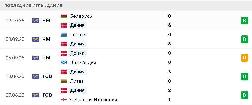 В пяти последних матчах в разных турнирах датчане показали очень хорошие результаты, одержав победы над Литвой, Северной Ирландией, Грецией и Беларусью.