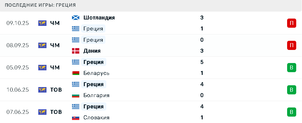 В пяти последних матчах в разных турнирах греческая сборная одержала победы над Словакией, Болгарией и Беларусью. Также были поражения от Дании и Шотландии.