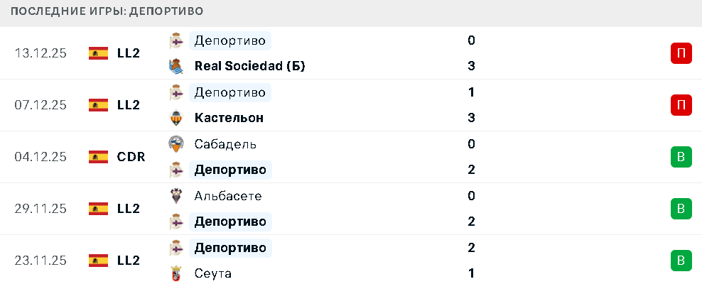 Галисийский клуб неплохо выступает на выезде, одержав две победы подряд над «Сеутой» и «Альбасете», забив по два гола в каждом из этих матчей. Однако в домашних встречах дела обстоят значительно сложнее: два поражения подряд с общим счётом 1:6 подчёркивают оборонительные проблемы команды перед собственными болельщиками. Несмотря на это, «Депортиво» занимает второе место в Сегунде и остаётся одним из главных претендентов на повышение в классе.