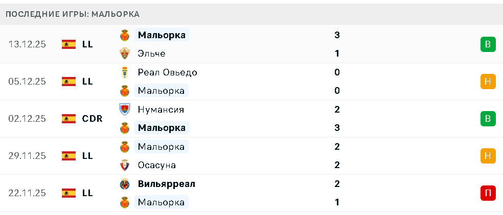 Команда с Балеарских островов проводит непростой сезон в Ла Лиге, однако постепенно обретает стабильность. В восьми последних турах «Мальорка» потерпела лишь три поражения, а победы над «Севильей», «Хетафе» и «Эльче» позволили ей подняться в середину турнирной таблицы. Особенно стоит отметить игру в атаке — в пяти последних матчах команда забивала в среднем почти по два мяча за встречу.