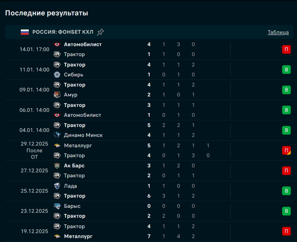 «Трактор» уверенно расправился с «Сибирью» и «Амуром» на своём льду, затем переиграл «Автомобилист» и уступил ему же в гостях со счётом (1:4). Единственное поражение в пяти матчах было выездным, тогда как дома команда демонстрирует стабильную атакующую мощь. В четырёх из пяти последних встреч проходил тотал больше 5,5 шайб, что отражает открытый стиль и слабую дисциплину в обороне.