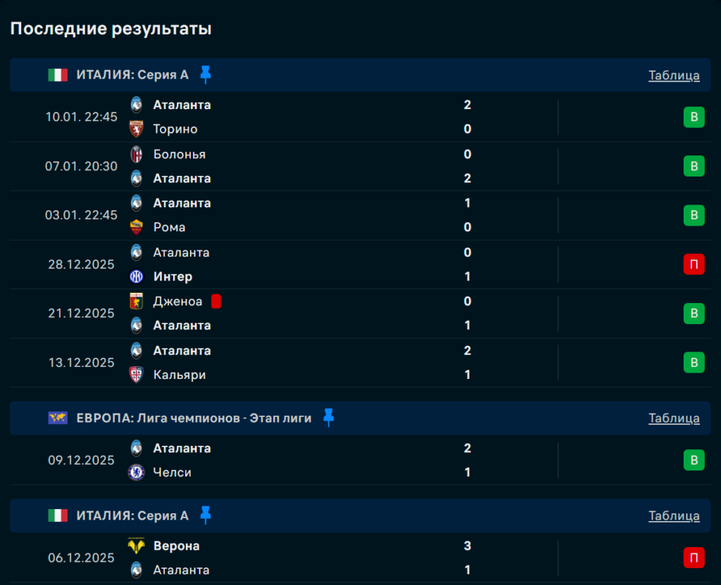 Последние игры Аталанта