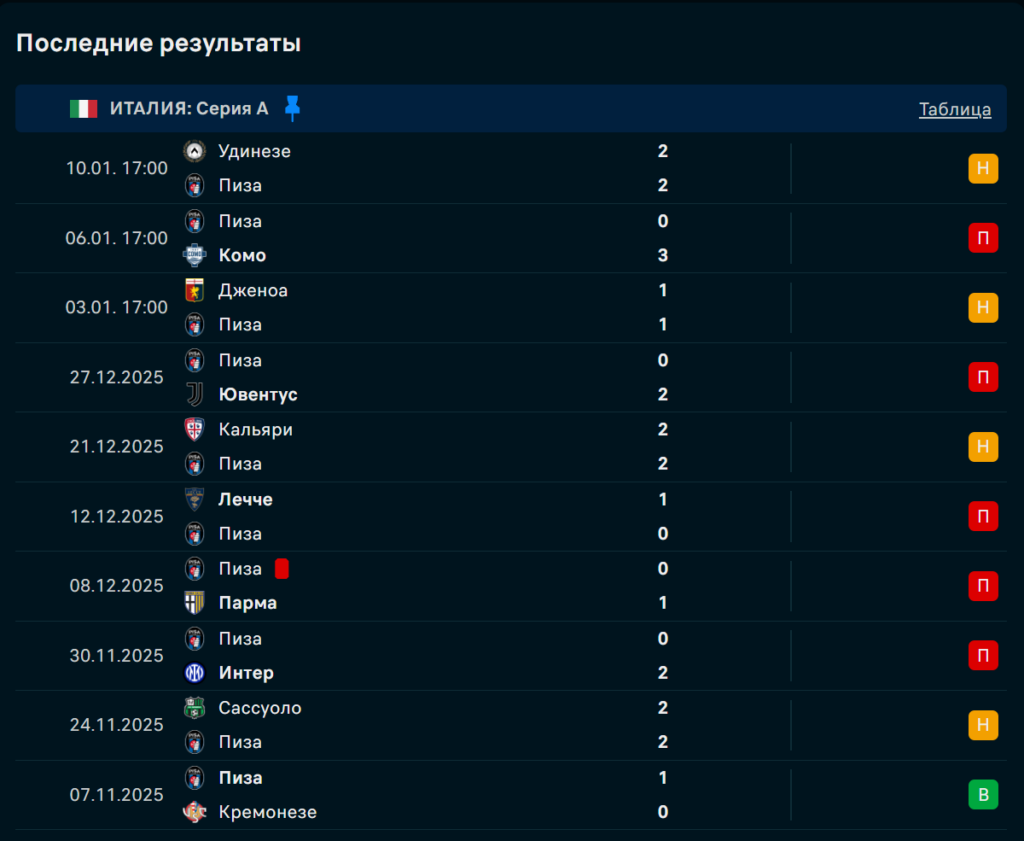 Последние игры Пиза