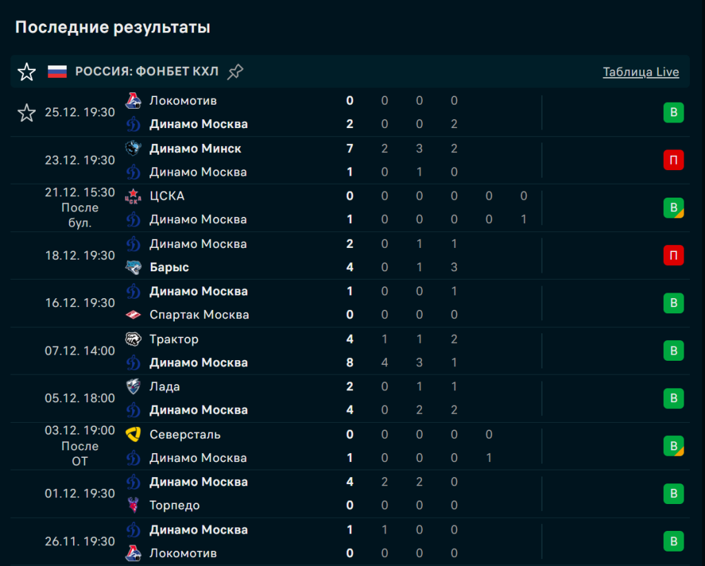 25 декабря «Динамо» Москва обыграло «Локомотив» (0:2), но до этого крупно уступило в Минске (1:7), а также победило ЦСКА (1:0 по буллитам), «Ладу» (4:2) и «Северсталь» (1:0 в овертайме). Четыре из пяти матчей завершились с тоталом меньше 5,5, но последний — с 8 шайбами.
