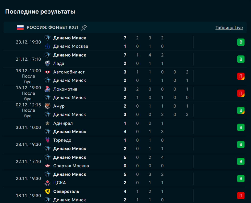 23 декабря «Динамо» Минск разгромило «Динамо» Москва (7:1), до этого выиграло у «Лады» (7:2), «Амура» (3:2 по буллитам), «Адмирала» (4:1) и «Торпедо» (2:1). Во всех пяти матчах превышен тотал 5,5 шайб. Команда забрасывает минимум 2 шайбы в каждом домашнем поединке с ноября.