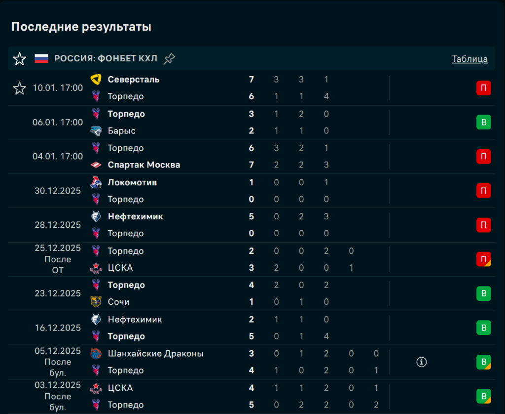 «Торпедо» победило «Барыс» (3:2), уступило «Северстали» (6:7), «Спартаку» (6:7), «Локомотиву» (0:1) и «Нефтехимику» (0:5). В четырёх из пяти матчей команда пропускала минимум 5 шайб. Оборона регулярно проваливается при давлении, особенно в третьих периодах.