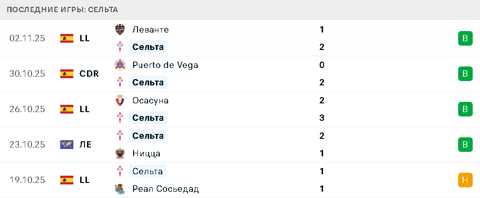 В пяти последних матчах в разных турнирах «кельты» сыграли вничью с Реал Сосьедадом и одержали победы над Ниццой, Осасуной, Пуэрто де Вега и Леванте.