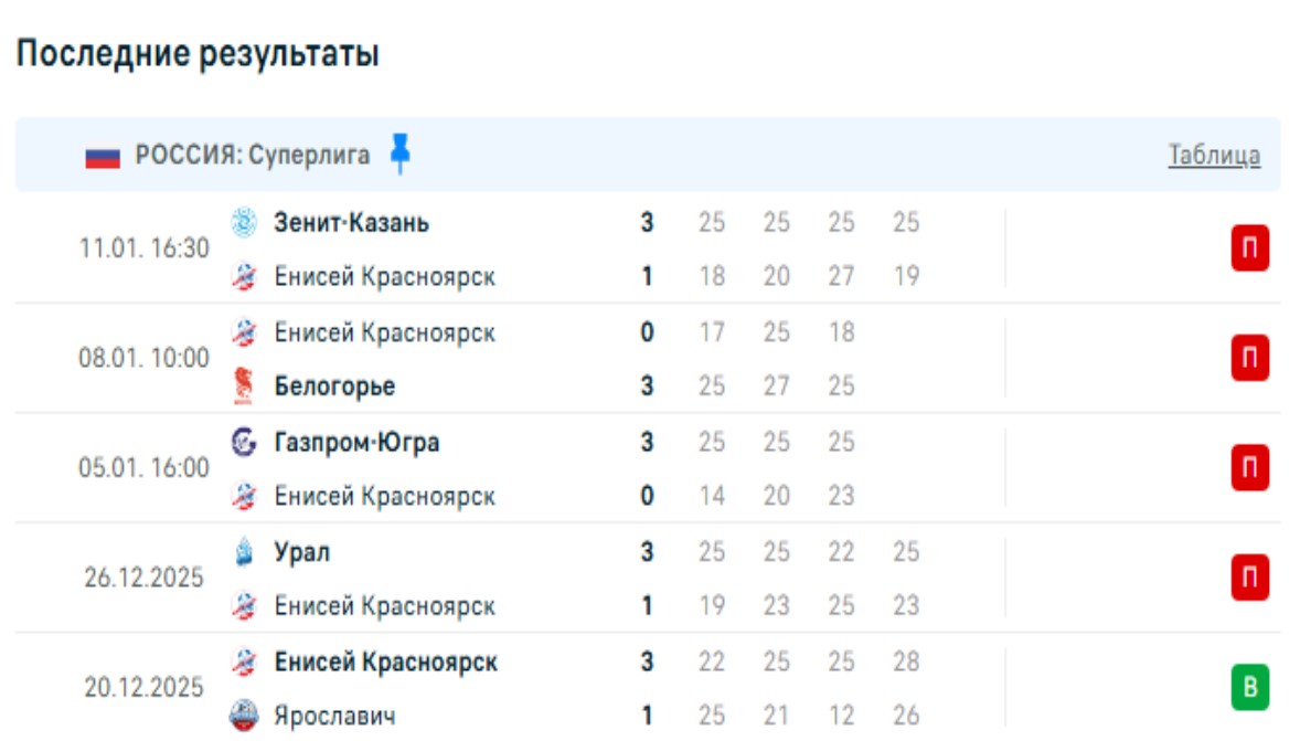 В предыдущих 4 проигранных матчах Енисей потерпел поражения от аутсайдера Динамо-Урал (1:3) и соседа по таблице Газпром-Югры (0:3). Также проиграл ведущему борьбу за попадание в плей-офф Белогорью (0:3). В прошлом туре подопечные Филиппова уступили лидеру Зениту-Казань. В столице Татарстана Енисей сумел забрать на балансе третью партию 27:25, однако в остальных сетах не составил хозяевам конкуренции.