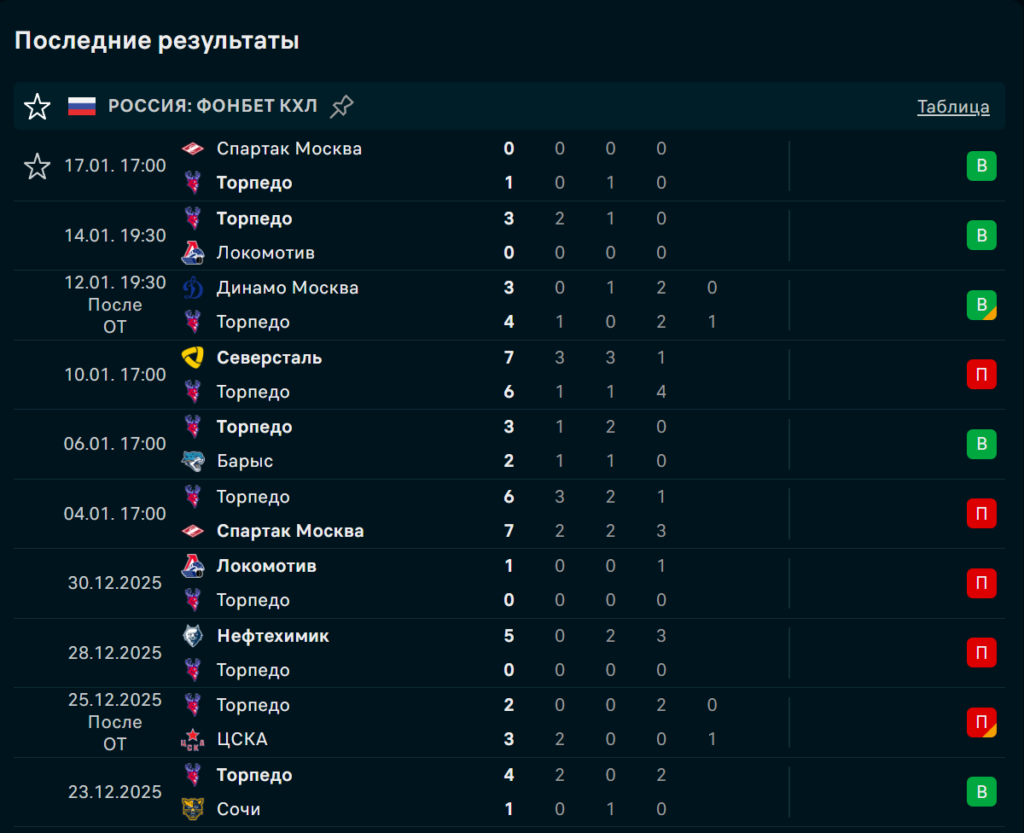 «Торпедо» показывает контрастную игру: от сухих побед (3:0 над «Локомотивом» в ноябре) до крупных поражений (0:4 от «Металлурга»). Атака забрасывает 131 шайбу, но оборона пропускает 125 — худший показатель среди топ-5 Запада. Команда уязвима при сменах и в большинстве, особенно без Кручинина и Принса, обеспечивающих глубину атаки.