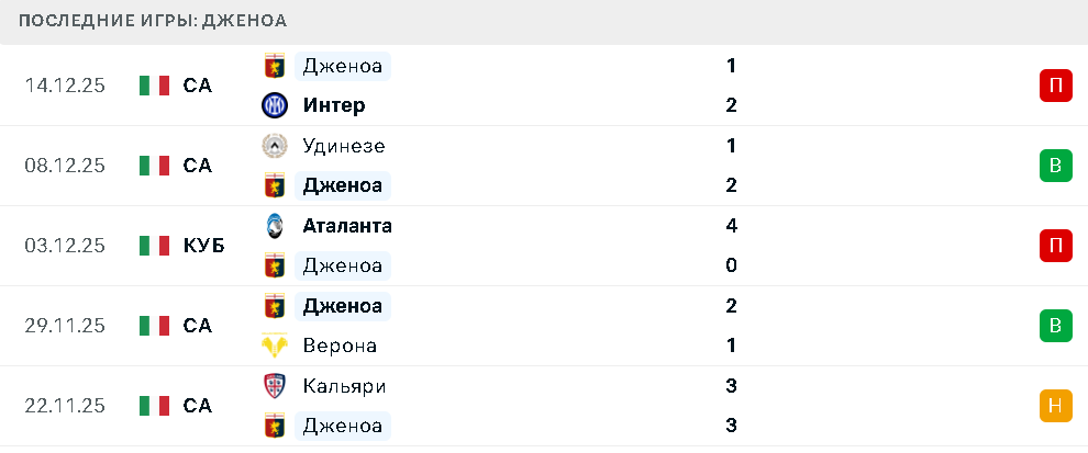 В пяти последних встречах «Дженоа» чередовала победы над «Вероной» и «Удинезе» с поражениями от «Аталанты» и «Интера», а также сыграла вничью с «Кальяри».