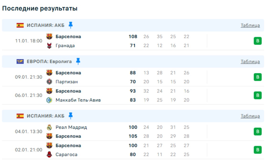 В Евролиге Барселона в конце декабря проиграла на выезде Фенербахче (71:72) и дома Монако (74:90). Реабилитироваться за эти неудачи удалось в новом году. Сначала команда Паскуаля дома была сильнее проводящего неудачный сезон Маккаби 93:83. В прошлом туре уверенно обыграла в Каталонии главного андердога белградский Партизан 88:70.