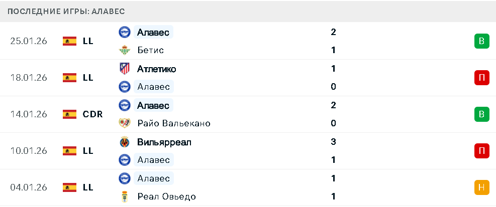 Помимо победы над «Бетисом» в рамках чемпионата Испании, в пяти последних матчах «Алавес» также сумел обыграть «Райо Вальекано». В этот же период команда на выезде уступила «Вильярреалу» и «Атлетико», а также сыграла вничью с «Овьедо». В целом форма гостей остается нестабильной, особенно в гостевых встречах.