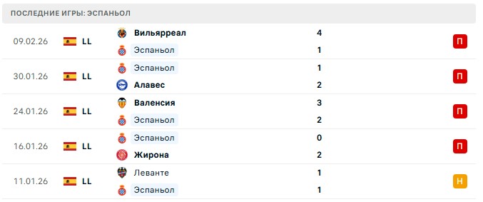 В последних пяти очных встречах Эспаньол выиграл четыре раза: 0:1 в гостях в ноябре 2025 года, 2:0 в апреле 2025 года на выезде и 3:1 дома в ноябре 2024-го. Единственная победа Сельты пришлась на март 2023 года (3:1 в гостях). За этот период домашние игры Эспаньола проходили результативно, но с осторожным первым таймом.