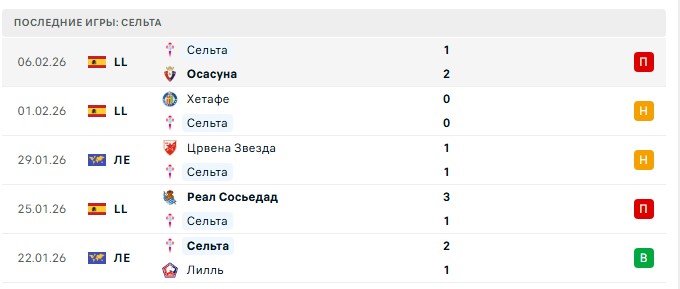 Последний матч: Сельта дома уступила Осасуне 1:2, пропустив оба мяча до перерыва и отыграв один гол с пенальти во втором тайме.