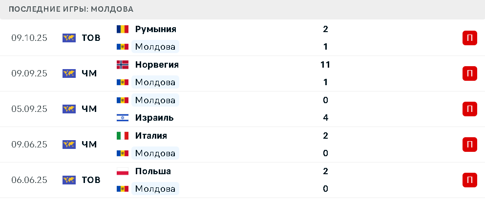 В пяти последних матчах молдавская сборная проиграла Польше, Италии, Израилю, Норвегии и Румынии.