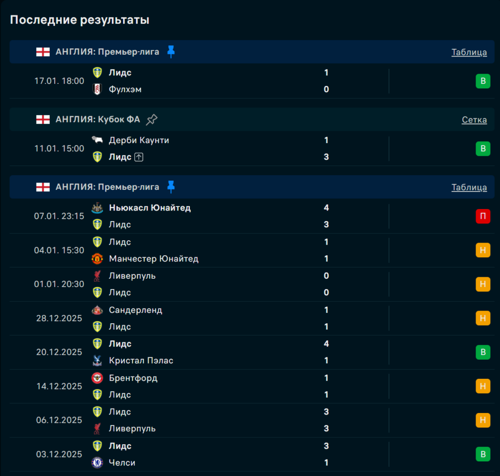 Ничьи с «Манчестер Юнайтед» (1:1) и «Ливерпулем» (0:0), победа над «Фулхэмом» — все эти матчи подтверждают: гости умеют держать темп даже против элиты. Особенно показательна игра с «Челси» (3:1): высокий прессинг, быстрые фланги, точное завершение. На выезде «Лидс» часто пропускает в первом тайме, но во втором демонстрирует характер — 7 из 10 последних выездных матчей были спасены после перерыва.
