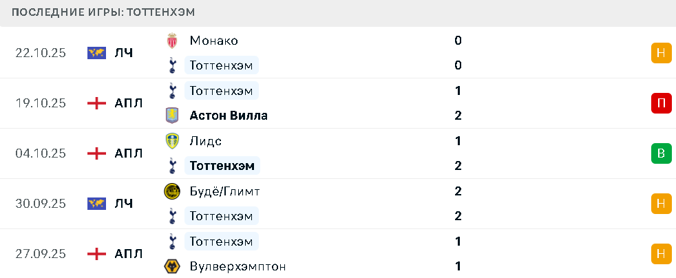 «Шпоры» намного успешнее выступают в этом сезоне. К 9-му туру команда подходит с 14 очками, располагаясь на 6-м месте в турнирной таблице. Лондонцы прилично забивают (14), и довольно надежно играют в обороне (7 пропущено). В предыдущем туре Тоттенхэм принимал Астон Виллу и потерпел поражение 1:2, прервав, таким образом, долгую беспроигрышную серию.