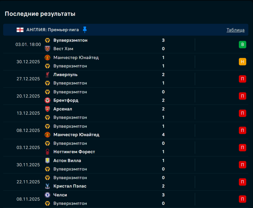 Последние игры Вулверхэмптон
