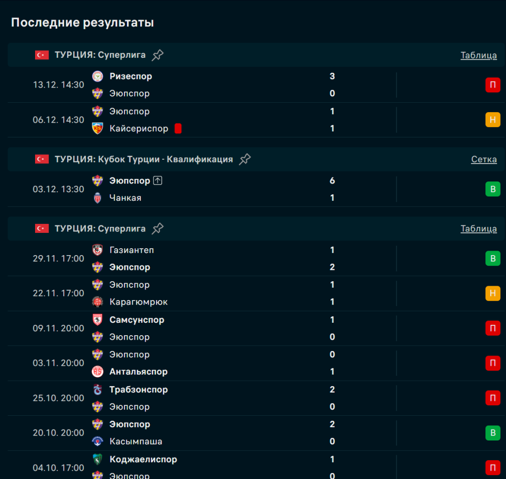 20 декабря, 17:00 МСК, стадион «Recep Tayyip Erdoğan Stadyumu», Стамбул. Семнадцатый тур турецкой Суперлиги. «Эюпспор» занимает 17-е место с 13 очками, разница мячей — 10:21. «Фенербахче» — 2-й с 36 баллами, разница 36:14. Хозяева борются за выживание, но демонстрируют худшую атаку лиги — всего 10 голов за 16 матчей. Гости не проигрывают в чемпионате 16 туров подряд, забивая в среднем 2,25 гола за игру.