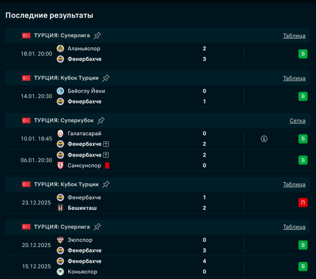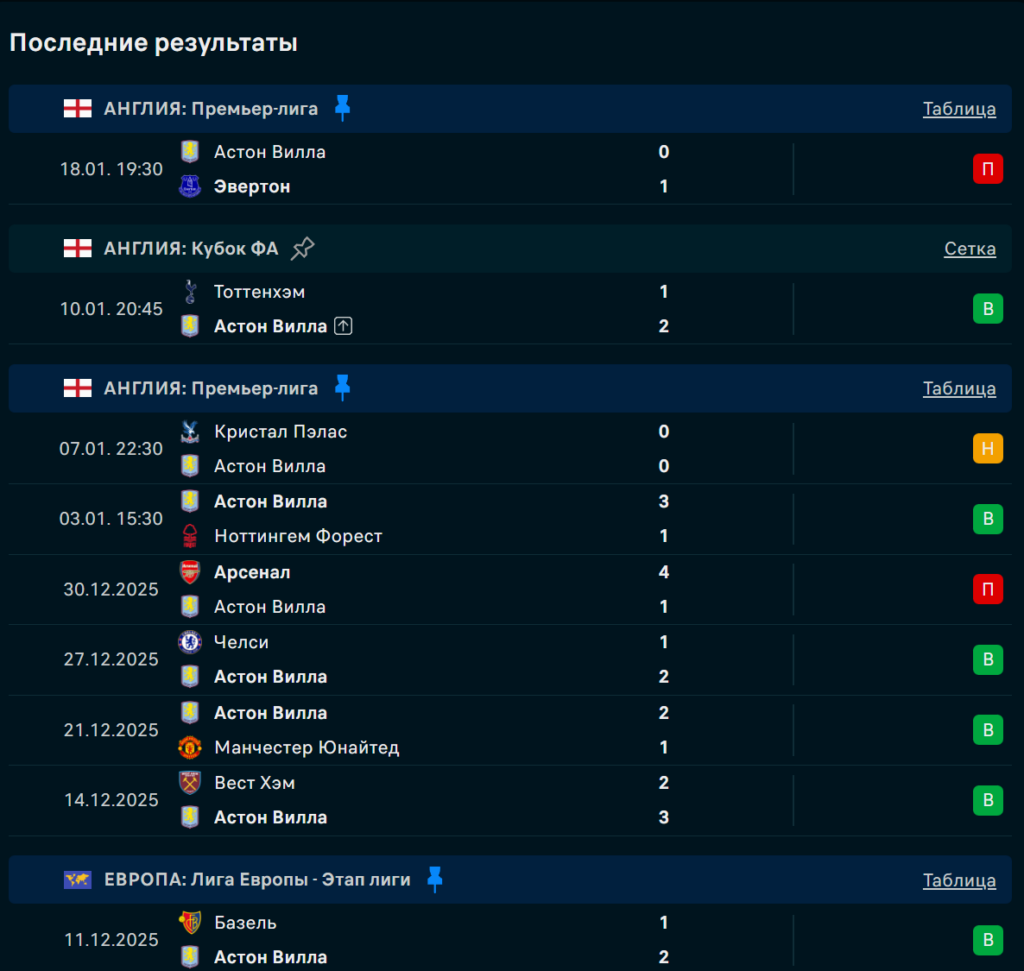 22 января, 20:45 МСК, «Шюкрю Сараджоглу», Стамбул. Лига Европы УЕФА, 7-й тур общего этапа. «Фенербахче» занимает 12-е место с 11 очками, «Астон Вилла» — 3-е с 15. Турки не проигрывают 18 матчей подряд во всех турнирах, включая победу над «Бранном» (4:0) в Лиге Европы. Англичане потерпели поражение от «Эвертона» (0:1) и пропустили ключевых игроков. Для хозяев это шанс пробиться в топ-8, для гостей — сохранить позиции.